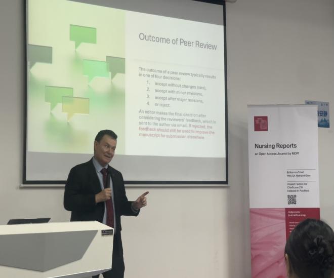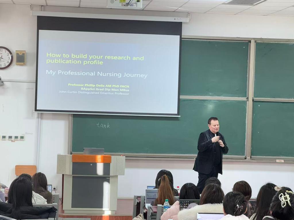 在1月7日的学术交流活动中,Phillip Della教授以“How to build your research and publication profile-My Professional Nursing Journey”为题,结合其四十余年学术与政策领导经验,系统阐述了如何从明确的研究计划出发,构建可持续的科研体系,并就期刊选择、学术产出规划、ORCID使用及研究影响力拓展等提供了具体建议,为师生勾勒出清晰的科研发展路径。