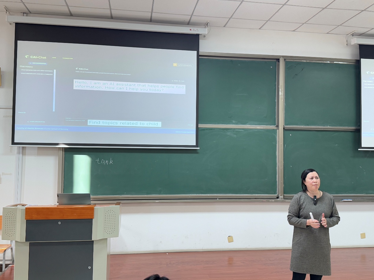 Jo Zhou博士则以“3in1:My RN Journey in Australia”为主题,聚焦论文写作与人工智能应用。她以CAI-Chat为例,演示了AI在写作中的辅助功能,并强调研究者须保持学术自主性-AI应为学术表达提供支持,而非替代思想生成。在问答环节,师生就AI辅助写作的合理性、翻译准确性、中医护理投稿优势等问题踊跃提问,Zhou博士和Della教授均给予了实用且可操作的建议。
