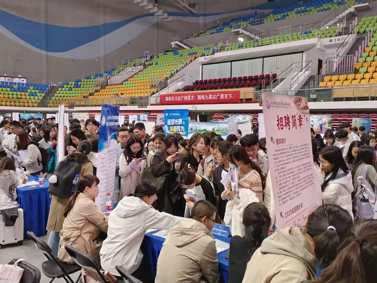 在天津中医药大学2025届毕业生秋季专场双选会的体育馆主会场,同学们现场投递简历,为大家提供了向用人单位咨询信息的机会,能帮助毕业生更好地了解岗位详情、公司情况等,为求职做好充分准备。