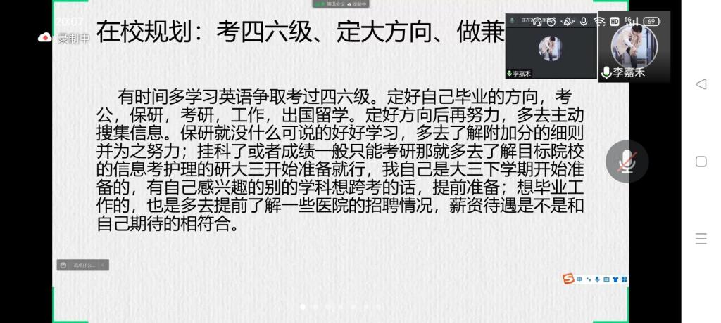 学长有着丰富多彩的大学生活:2016年加入院、校学生会外联部,在保康医院跟诊,参加北京市第一届男护士论坛;2017年加入循证医学中心培训班和全运会,并发表第一篇论文;2018年进行天使创思课题的研究,在循证中心进行工作;2019年前往韩国成为交换生,进行中韩男护士心理健康课题等。学长指出在大学生活期间,要丰富自己的生活,不断充实、提高自己的能力,为以后的道路做铺垫。