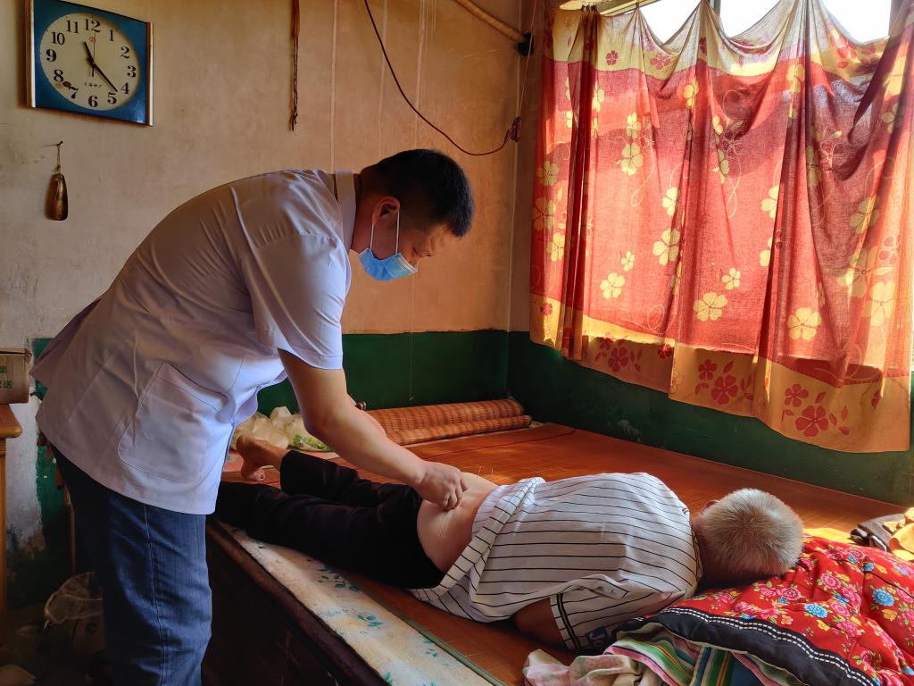 随后,吴喜庆老师还带领护理专业学生走进村民家中,为行动不便的七十余岁的张大爷健康查体、进行中医针灸治疗,把中医药知识和贴心的医疗服务送到农民家中。