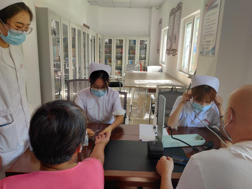 上午九点,实践团到达霍各庄镇张台村党群服务中心,分别进行抗疫精神宣讲和团体心理辅导,向村里老人讲述老年护理、中医药知识普及、急救知识,以及八段锦、太极拳等基础教学,并且向村里老人、妇女及孩子免费提供基础医疗服务。